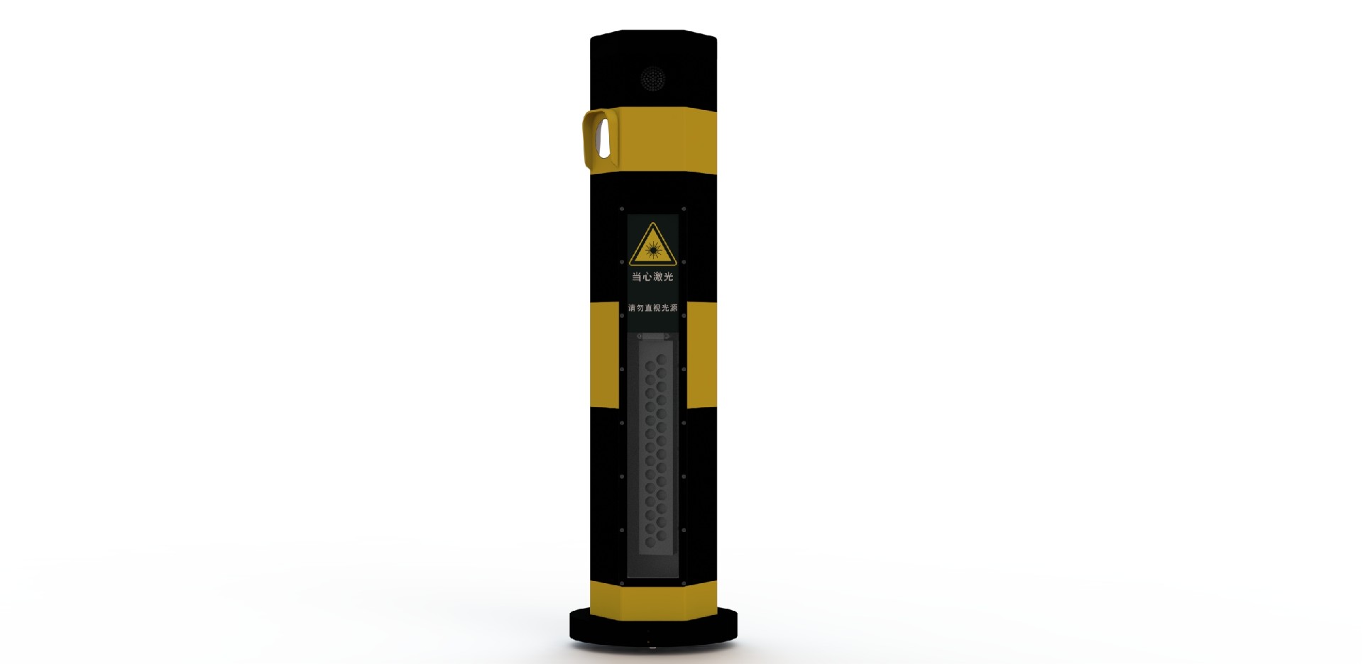 在與廠家技術人員溝通得知,該機采用激光+紅外的雙感知方案,激光燈組由日立原封28顆激光燈(200毫安)組成,以扇形90度投射激光線,激光燈上下間隔1CM,激光燈組整體高度為26CM,激光不會直射人眼。行人感應器有效探測范圍20米。還具有傾斜保護和行人近距離保護功能,當激光樁意外傾斜或有行人靠近激光燈范圍30cm以內時,激光燈關閉,起到一個很好的保護行人的作用。