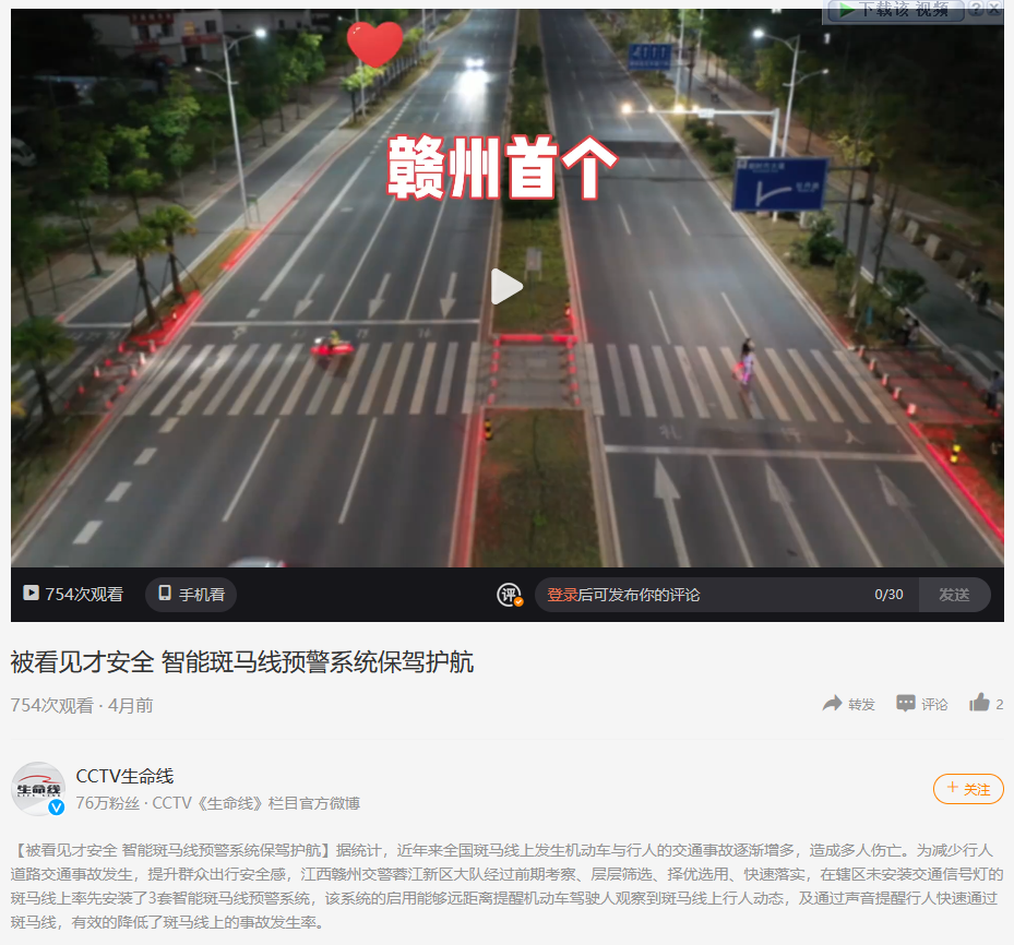 【被看見才安全 智能斑馬線預(yù)警系統(tǒng)保駕護(hù)航】 據(jù)統(tǒng)計(jì),近年來全國(guó)斑馬線上發(fā)生機(jī)動(dòng)車與行人的交通事故逐漸增多,造成多人傷亡。為減少行人道路交通事故發(fā)生,提升群眾出行安全感,江西贛州交警蓉江新區(qū)大隊(duì)經(jīng)過前期考察、層層篩選、擇優(yōu)選用、快速落實(shí),在轄區(qū)未安裝交通信號(hào)燈的斑馬線上率先安裝了3套智能斑馬線預(yù)警系統(tǒng),該系統(tǒng)的啟用能夠遠(yuǎn)距離提醒機(jī)動(dòng)車駕駛?cè)擞^察到斑馬線上行人動(dòng)態(tài),及通過聲音提醒行人快速通過斑馬線,有效的降低了斑馬線上的事故發(fā)生率。